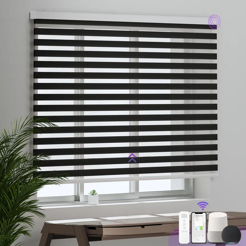 Contemporary zebra blinds with alternating sheer and opaque stripes